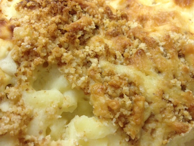 Add cheese: 2 parts grated white cheddar, 1 part grated muenster  and monterey jack. Something like 2-3 cups depending on how cheesy you like your mac. Reserve a little for your topping. Add more milk if it seems too thick. Taste for seasoning. Blandness is a no-no. Envelop macaroni and cheese sauce together. Stir. Pour into a buttered casserole dish and top with buttered browned breadcrumbs and cheese. (For the breadcrumbs, toast crumbs in a little skillet with a dab of butter. Stir until you are bored and they get toasty and yummy). Bake in a 350 degree oven for 25-30 minutes or until bubbling and topping is golden brown. And oh yes, enjoy. We enjoyed it so much we forgot to take a picture, but I’ll work on that shortly.