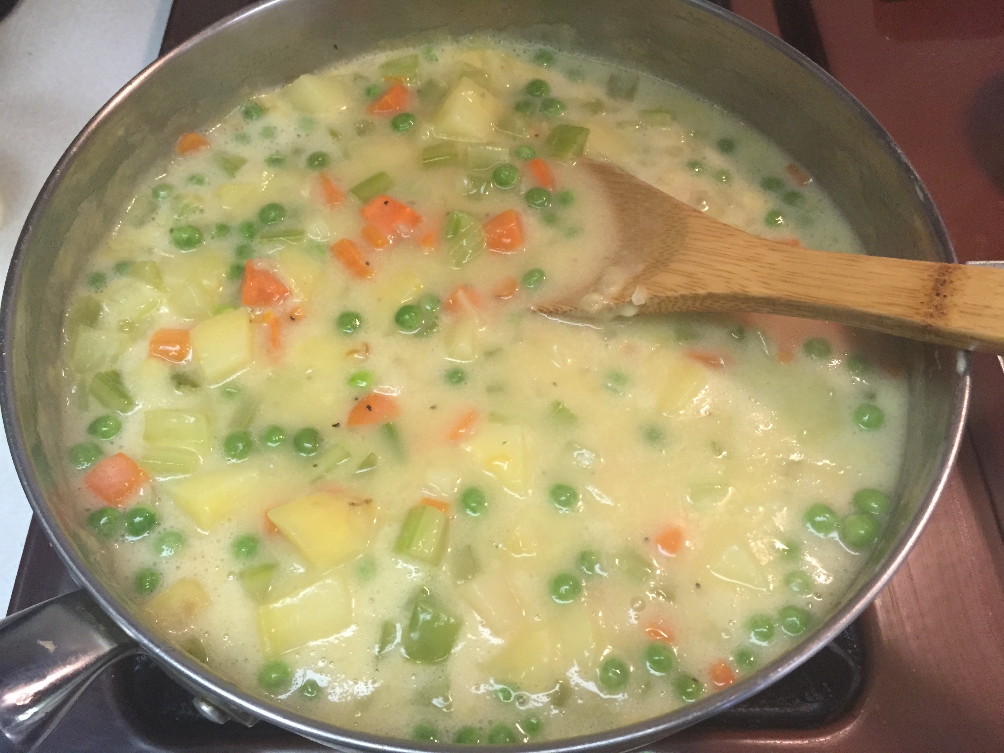 IMG_2763Do you remember the sublime delight of your own individual pot pie in the aluminum foil pie tin from the grocery store freezer and baked in your oven at home? I certainly do, but the anticipation of my very own pot pie for dinner diminished rapidly after the first few bites. Where was the chicken? The crust wasn’t too flaky, either. And finding peas was like searching for gold. Lots of work and not much payoff. Kiss those kiddie potpies goodbye with this luscious redux, so simple that’s it’s hardly a recipe and more like a template for a luscious crusty dinner. You’ll learn a few piecrust tips, too. And don’t tell anyone the secret ingredient, which I painfully realized was essential to the unctuousness of this dish when I insisted on a handmade broth and cream sauce which fell flat.